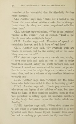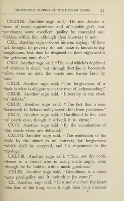 ![chapter. ^ PROFITABLE SAYINGS OF THE HEBREW SAGES. CXXVL A certain Hebrew sage said, “Chastity and “wantonness exist not only in act, but also in word/’ CXXVII. Unto another rich Hebrew sage it was said, “Why dost thou suffer hunger seeing that thou lackest “nothing?” And he replied, “Because I do not forget “those who hunger and are in want.” CXXVIII. Another Hebrew sage wrote over the door of a prison, “This is the house of tribulation, wherein “life is buried, and wherein the love of friends and the “hatred of enemies are tried.” CXXIX. Another Hebrew sage said, “Let thine “enemy who is feeble be considered a mighty man “by thee in order that thou mayest not neglect to be- “ware of him, and let thy strong friend be accounted “a feeble man by thee, thus that thou mayest rely upon “his support, and thou shalt [not] be harmed by thy “companions.” eXXX. Another sage said, “It is not meet for a “king to hasten to [take] vengeance, because he is able “to avenge himself whensoever he pleaseth.” CXXXI. A certain ascetic saw a man eating flesh and he said, “Behold flesh eating flesh.” CXXXII. It is said that a certain ascetic entreated God to shew him flesh wherein was no blood in order](https://iiif.wellcomecollection.org/image/b30095402_0075.jp2/full/800%2C/0/default.jpg)