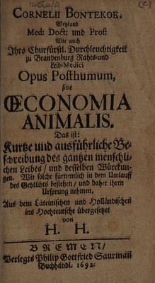 Credit: Kurtze Abhandlung von dem menschlichen Leben, Gesundheit, Krankheit und Tod, in drey ... Theilen verfasset. Davon das I. Unterricht giebet von dem Leibe ... II. Von der Kranckheit ... III. Von denen Mitteln, das Leben und die Gesundheit zu unterhalten und zu verlängern ... Wobey noch angehänget drey kleine Tractätlein, I. Von der Natur. II. Von der Experienz oder Erfahrung. III. Von der Gewissheit der Medicin oder Heilkunst. Erstlich in holländischer Sprache beschrieben ... / [Cornelis Bontekoe]. Source: Wellcome Collection.