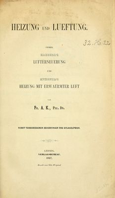 Heizung und Lueftung : ueber Haeberl's Lufterneuerung und Meissner's Heizung mit erwaermter Luft / von Fr. A.K.