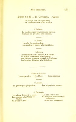 ![Dinner fo3 16 or 20 Persons. February Mock turtle soup. Carlton House soup. 2 Fishes. Turbot with lobster sauce. Fillets of soles a la Rouennaise. Glazed ham with spinach. Capons with truffles a la Perigucux. Chartreuse of partridges. Croustade with quenelles a la Lucullus. Mutton cutlets larded, chcvreuil sauce. Salmis of snipes a la bonne-bouche. Fricassee of chickens with mushrooms. Supreme of pheasant, puree of chestnuts 2 Removes. 0 Entrees. Hare. Second Course. [2 Roasts.] Widgeon. 2 Removes. Teed biscuits with vanilla. Souffle of ground rice. 6 Entremets. Broccoli with Parmesan cheese. Aspic border with Italian salad. Orange jelly. Chocolate cream. Pears a la Conde. Genoese glace's with noyeau](https://iiif.wellcomecollection.org/image/b21527325_0498.jp2/full/800%2C/0/default.jpg)