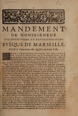 Credit: Mandement ... pour l'ouverture des eglises / [Henri François Xavier de Belsunce de Castelmorón]. Source: Wellcome Collection.