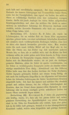 ![()l uormes; sie war nur absolut taub uud war noch taumelig iu der Art, dass sie mauclmial binfällt. Jetzt 6 Jahre alt. 6) Carl Conrad aus Gr.-Bresa, etwa 2 Meilen nordwestlich von Breslau, 13 Jahre alt, erkrankte im Februar 1863 an Nerven- fieber [?]; verlor schon am zweiten Tage das Gehör und blieb es fort; phautasirte stark, war nur 14 Tage krank, sagte am zweiten Tage der Krankheit: „Es sticht aus den Ohren“. Diese Bemerkung ist besonders beachtenswerth, eine Bemerkung wie in dem Falle von Dr. Keller. Nirgends eine Epidemie von Meningitis cerebro-spinalis. Für den Kundigen bedarf es keiner weiteren Auseinandersetzung, dass dieser Fall kein Nervenfieber gewesen sein kann, denn 1) ist dasselbe bei Kindern selten; 2) verläuft es unmöglich in 14 Tagen bis zur vollen Genesung, und 3) wird heim Nervenfieber der Kranke nicht schon am zweiten Tage taub. 7) Eichard EieUier, ebenfalls aus Schildberg, Provinz Posen, 6 Jahre alt [1863]; erkrankte damals 8 Tage vor Ostern, also 1 Jahr später als das vorige Kind an demselben Orte, unter Er- brechen, Prostschauer, daun Hitze, Phantasiren durch 8 Tage, al)er unbedeutend. Schon am dritten Tage verstand er die Mutter nicht mehr, meinte in der Keconvalescenz wiederholt: „sie läuten, sie trommeln“. Taumeliger Gang, sonst im Ohr nichts Al)iiormes zu finden. Keine Epidemie von Meningitis. 8) August Wätzke aus Ober-Stephausdorf, 4 Meilen nord- westlich von Breslau, erkrankte Ostern 1863 unter denselben Ei- scheinungen; absolut taub. 9) Gustav Hake aus Pilsen bei Schweidnitz, 3 dahre alt, eikrankte October 1863 unter gleichen Erscheinungen; taub. 10) Herr mann Hein aus Löwen, 9 Meilen südöstlich von Bieslau, 5 Jahre alt, erkraulvte unter ähnlichen Erscheinungen Anfang 1864 uud wurde sofort taub uud blieb es. 11) Maiie Bert hold, 5V2 Jahre, aus Zeitz in Thüriugen, erkranlde zu Pfingsten 1864 unter den angegebenen Erscheinungen der Otitis labyrinthica, uud schon bald iu der Krankheit merkte man, dass sie absolut taub war. 12) Clara Weingart, 2 Jahre alt, aus Erfm-t, erkrankte 1864; taub. 13) Auguste Pipke aus Langwaltersdorf bei Waldeubiii •o- iin](https://iiif.wellcomecollection.org/image/b22336333_0067.jp2/full/800%2C/0/default.jpg)