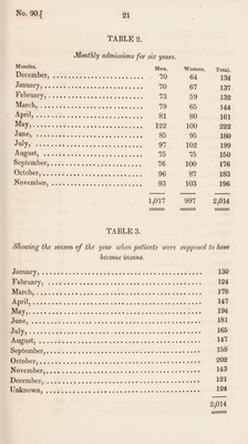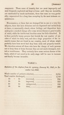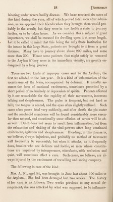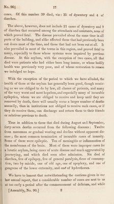 ![cases. Of this number 39 died, viz : 35 of dysentery and 4 of diarrhea. The above, however, does not include 21 cases of dysentery and 9 of diarrhea that occurred among the attendants and assistants, none of which proved fatal. The disease prevailed about the same time in all parts of the building, and alike affected those that had previously been out doors most of the time, and those that had not been out at all. It also prevailed in most of the towns in this region, and proved fatal to many, especially to those whose systems were impaired by previous disease. At this asylum, with the exception of two cases, all that died were patients who had either been long insane, or whose bodily health was previously very poor, and of whose restoration to reason we indulged no hope. With the exception of the period to which we have alluded, the health of those at the asylum has generally been good, though receiv¬ ing as we are obliged to do by law, all classes of patients, and many of the very worst and most hopeless, and especially many of incurable epileptics, whom we are obliged to receive and keep until they are removed by death, there will usually occur a larger number of deaths annually, than in institutions not obliged to receive such cases, or if they do receive them, can discharge and return them to their friends or relatives previous to death. Thus in addition to those that died during August and September, forty-seven deaths occurred from the following diseases : Twelve from marasmus or gradual wasting and decline without apparent dis¬ ease ; the most common termination of incurable cases of insanity. Some of these were epileptic. Ten of meningitis or inflammation of the membranes of the brain. Most of these were improper cases for a lunatic asylum, being cases of acute disease and much aggravated by journeying, and which died soon after admission. Six died of diarrhea, five of epilepsy, five of general paralysis, three of consump¬ tion, two by suicide, one of old age, one of apoplexy, and one of gangrene of the lower extremity, and ond of hydrothorax. We have to lament that notwithstanding the cautions given in our last annual report, that a considerable number of cases are sent to us at too early a period after the commencement of delirium, and while [Assembly, No. 90.] 2](https://iiif.wellcomecollection.org/image/b30317551_0019.jp2/full/800%2C/0/default.jpg)