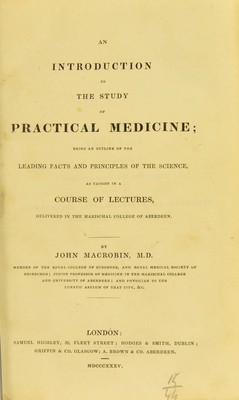 An introduction to the study of practical medicine : being an outline of the leading facts and principles of the science, as taught in a course of lectures, delivered in the Marischal College of Aberdeen / by John MacRobin.