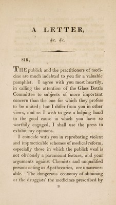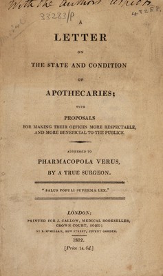 ![« A LETTER ON THE STATE AND CONDITION op APOTHECARIES; WITH PROPOSALS FOR MAKING THEIR OFFICES MORE RESPECTABLE, AND MORE BENEFICIAL TO THE PUBLICK. ADDRESSED TO PHARMACOPOLA VERUS, BY A TRUE SURGEON. “ SALUS POPULI SUPREMA LEX. LONDON: PRINTED FOR J. CALLOW, MEDICAL BOOKSELLER, CROWN COURT, SOHO; JJY B, MCMILLAN, BOW STREET, COVENT GARDEN. 1812, [Price Is, 6d*]](https://iiif.wellcomecollection.org/image/b30360195_0001.jp2/full/800%2C/0/default.jpg)