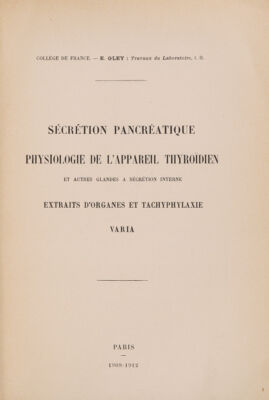 Credit: Sécrétion pancréatique : Physiologie de l'appareil thyroïdien et autres glandes a sécrétion interne : Extraits d'organes et tachyphylaxie : Varia. Source: Wellcome Collection.