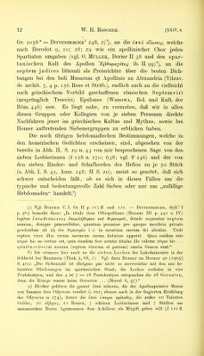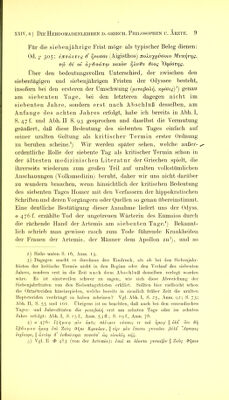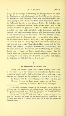 ![Belege für die einstige Verwendung der heiligen Sieben im Laufe der Jahrhunderte und Jahrtausende auf den Gebieten der Literatur, der Inschriften, der bildenden Kunst uns unwiederbringlich ver- loren gegangen sind. Wenn wir trotz dieser ungeheuren Verluste die Siebenzahl bereits in den ältesten Kulten der Griechen eine wenigstens annähernd ähnliche Eolle spielen sehen, wie in den heiligen Schriften des jüdischen Volkes, so dürfte diese Tatsache sicherlich auf eine außerordentlich große Bedeutung und Ver- breitung der hebdomadischen Fristen und Bestimmungen schon in den allerältesten Zeiten hinweisen. Für diese Annahme spricht namentlich auch der Umstand, daß — wenn nicht alles trügt — die hebdomadischen Fristen noch älter und ursprünglicher sind als die in der Zeit des älteren Epos stark verbreiteten enneadischen und sich mit sehr großer Wahrscheinlichkeit ebenso auf die Vier- teilung des ältesten 28tägigen Mondmonats (Lichtmonats), wie die enneadischen und dekadischen auf die Dreiteilung des späteren Monats von 27 bezw. 30 Tagen, zurückführen lassen. Das Ge- nauere siehe im systematischen Inhaltsverzeichnis zu meiner Ab- handlung über die Sieben- und Neunzahl im Kultus und Mythus der Griechen [= Abh. II]*) S. 115 ff. u. S. 69 f. B. Die Hebdomaden im älteren Epos. Fristen von sieben Tagen oder Jahren kommen zwar nicht in der Ilias vor, in der vielmehr die enneadischen Fristen außer- ordentlich häufig sind^), finden sich aber öfters, und zwar nicht weniger als achtmal, in der Odyssee (s. Abh. I 8.46! u. S. 60). Als Beispiel für die siebentägige Frist führe ich hier an: Od. z 80; s^fj^iaQ (ih> ouäg jtXeo^iev vvztccg xe %al r]iucQ^ eßdo^idx]/ d’ fzö^ieö&a ylä^iov ai:itv JttoXieü^Qov. *) Bei dieser Gelegenheit bemerke ich ein für allemal, daß ich meine Ab- handlung über die enneadischen und hebdomadischen Fristen und Wochen der ältesten Griechen mit Abh. I, die Schrift über die Sieben- und Neunzahl im Kultus und Mythus der Griechen dagegen mit Abh. II zitiere. i) Vgl. Abh. I, S. 15. — Doch findet sich in der Ilias wenigstens eine Frist von 7 Monaten im Mythus von dem Siebenmonatskinde Eurystheus T 117: 7j d’ invEi. (p/Aor vlov, 6 d’ sßdofiog ißzipet, ftftg' || ek d’ äyayE ngb (pötoßde nal ^InöfiTjuov Eovra.](https://iiif.wellcomecollection.org/image/b24876562_0014.jp2/full/800%2C/0/default.jpg)