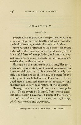 Hygiene of the nursery : including the general regimen and feeding of infants and children; massage, and the domestic management of the ordinary emergencies of early life / by Louis Starr.