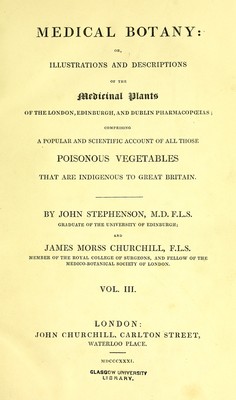 Medical botany, or, illustrations and descriptions of the medicinal plants of the London, Edinburgh and Dublin pharmacopoeias; comprising a popular and scientific account of all those poisonous vegetables that are indigenous to Great Britain / By John Stephenson, M.D. ... and James Morss Churchill, F.L.S.