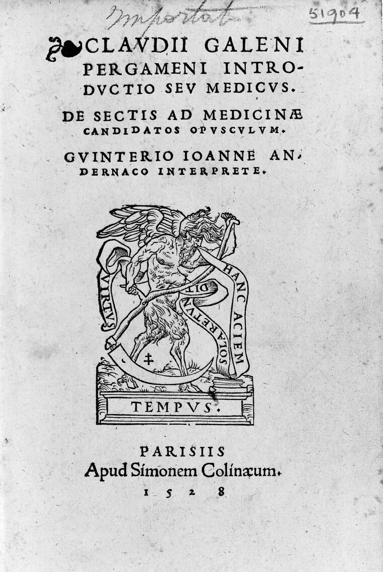 M0009004: Psuedo-Galen: <i>Claudi Galeni Pergameni Introductio seu medicus</i>, 1528: title page. In copyright. Source: Wellcome Collection.