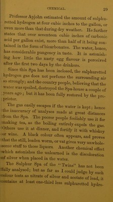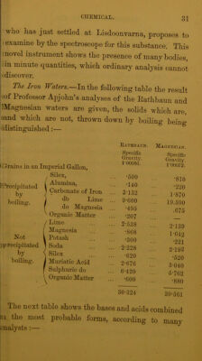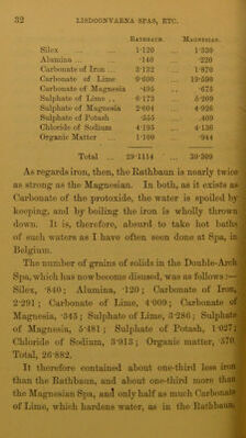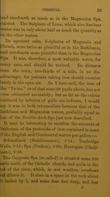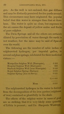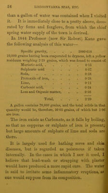 ![than a gallon of water was contained when I visited it. It is immediately close to a pretty alcove, deco- rated hy ferns and foxglove, from which the chief spring water supply of the town is derived.. In 1844 Professor (now Sir Robert) Kane gave the following analysis of this water— Specific gravity, . . . 1000-61S 10,000 grains having been evaporated to dryness, left a yellow residuum weighing 2 -29 grains, which was found to consist of. Muriatic acid, . 0-15 Sulphuric acid . . 0-57 Soda, 0-58 Protoxide of iron, .. 0-28 Lime, .... 0T1 Carbonic acid, 0-24 Loss and Organic matter, 0-36 Total, 2-29 A gallon contains 70,000 grains, and the total solids in that quantity would he, therefore, 16-03 grains, of which but 1-96 are iron. The iron exists as Carbonate, as it falls hy boiling, so that no copperas or sulphate of iron is present,; ; but large amounts of sulphate of lime and soda are I there. It is largely used for bathing sores and skia j diseases, but is regarded as poisonous if taken 1 internally. In the cases in which I saw it used, I believe that lead-wash or strapping with plaster j would have produced a more rapid cure. The water ;] is said to irritate some inflammatory eruptions, as one would suppose from its composition.](https://iiif.wellcomecollection.org/image/b22312018_0036.jp2/full/800%2C/0/default.jpg)