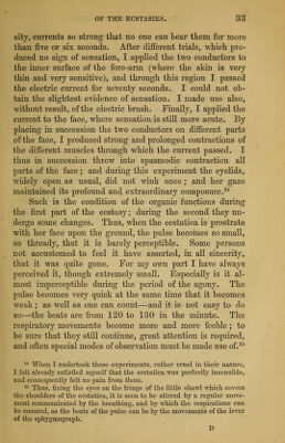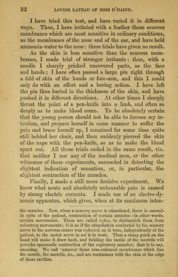 ![slight and partial winking continues; but when the ecstasy is at its height the eyelids are altogether motionless, and during whole hours there is not the slightest winking to be observed. The eyes, fixed on the far distance, do not respond to ordinary stimuli; an object may be passed suddenly before them, or a bright light brought rapidly near them, without causing any movement of the lids or of the eyeball itself. Hearing, like sight, is in abeyance, or at least the ear is insensible to ordinary excitants. Several times it has happened that one of the observers placed behind her has suddenly shouted loudly in her ears, and never has the slightest start given evidence that the auditory nerve trans- mitted the perception. Sensation, in general, is almost entirely absent during the ecstasy. I say, almost entirely. This reservation is necessary, for there is in fact one part of the body where sensation continues in a slight degree— it is the conjunctiva.^'^ In ev€ry other part of the body I have found it impos- sible to produce the slightest sign of sensation. I have- made many trials, and will now briefly record my experi- ments. It is well known that the best means of ascertain- ing the continuance of sensation is to observe the reflex movements when the skin or mucous membranes are strongly irritated. These movements indicate, beyond the control of their subject, the slightest traces of sensation.-^ 22 The conjunctiva is that delicate* membrane v,^liicli lines the inner surface of the eyelids, where it is rose-coloured, and thence passes over the eyeball, where it becomes very thin and quite trans]parent. The per- sistence of sensibility in the conjunctiva explains a phenomenon which I have several times observed in Louise Lateau : a bright light may be suddenly brought near the eyes without producing a wink; but if the open hand is rapidly pushed towards the face, as if going to strike it, a slight winking occurs; and this is caused bj the impact of air on the conjunc- tiva. A similar movement occurs when this membrane is touched by the tip of the finger. 23 By reflex movements are understood the involuntary movements produced when the sensory nerves are excited. There are two kinds of nerves, the sensory, which conduct to the nervous centres—the brai< and spinal cord—the impressions received by the senses; and the motor or conductors of the power of movement, which pass from these centres into](https://iiif.wellcomecollection.org/image/b21063904_0043.jp2/full/800%2C/0/default.jpg)