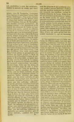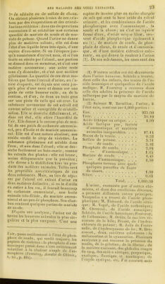 ![DES MALADIES DES VOIES UniNAinES. 3» lie sdlûnilc ou de sulfate de cliaux. On obtient plusieurs levées de ces cris- taux par des évaporalions et des crislal- lisalious réitérées : dans ces évaporalions successives il se cristallise une certaine quantité de murinte de soude et de niu- rialc de potasse. Quand l'urine ne donne plus de matières salines, elle est dans l'état d'un liquide brun très-épais, d'une espèce d'eau-nière. Si on l'évaporé jus- qu'à consistance d'extrait mou, et si l'on Iraile ce résidu par l'alcool, une portion se dissout dans ce menstrue, et c'est une matière savonneuse; une autre reste sans s'y dissoudre, et c'est une matière gélatineuse. La quantité de ces deux mn- tici cs que forme l'extrait d'urine, ou l'u- rine évaporée, est depuis une once jus- qu'à plus d'une once et demie sur une pinte de cette humeur cuite, ou delà coction, et d'un, de deux ou trois gros sur une pinte de celle qui est crue. La substance savonneuse de cet extrait est comme saline et susccplible de cristalli- .sation. Elle se dessèclie difficilement, et, dans cet état, elle attire l'humidilé de l'air. Elle donne à la cornue plus de moi- tié de son poids de carbonate ammonia- cal, peu d'huile et de muriale ammonia- cal. Elle est d'une nature alcaline; son résidu verdit le sirop de violettes. La substance gélatineuse est soluble dans l'eau , et non dans l'alcool ; elle se des- sèche facilement au bain-marie, comme les extraits des plantes : elle est brune, moins déliquesccnle que la première; elle donne à la distillation tous les pro- duits des matières animales. Telles sont les propriétés caraclérisliques de ces deux substances. Mais, au lieu de sépa- rer par l'alcool cet extrait d'urine en deux matières distinctes ; si on le distille en entier à feu nu, il fournit beaucoup de carbonate ammoniacal, une huile animale Irèi-fétide, du muriale ammo- niacal et un peu de ])hosphore. Son char- bon contient quelques parties de n)uriate de soude. D'après ces analyses, l'urine est de toutes les humeurs animales la plus sin- gulière et la plus composée. C'est une 1 air, passe enllèremcnt à l'ûiat de phos- ph.iie de soude, qui verdii loujours les papiers de violotics : le pliospliàle d'am- rnoiiiaquo parail donc s'circ enlu-ircmcnt volatilisé à la chaleur simple do Tat- niospln-Tc (/o^rcioy. Annales do Qhhnie, t. VII, p. 18.5). ' 23 espèce de lessive plus ou moini cliargée (le sels qui sont la base acide du calcul urinairc , et les combinaisons de l'acide phosphorique aveç l'ammoniaque , la soude et la chaux; ou c'est un liquide formé d'eau, d'acide urique libre, sou- vent d'acide phosphorique également à nu flj, de muriale de soude, de phos- phate de chaux, de soude et d'ammonia- que , et d'une matière cxtractive colo- rante , ou qui donne la couleur à l'urine (2). De ces substances, les unes sont des (1) D'autres acides ont été découverts dans l'urine humaine. Schéelc a trouvé, dans celle des enfants, des traces de l'a- cide benzoïqueel quelquefois de l'acide maliquc. RI. Fourcroy a reconnu dans celle des adultes la présence de l'acide sull'urique par le moyeu du muriatc do baryte. (2) Suivant M. TSerzélius, l'urine, à l'étal sain, contient sur 1,000 parties : Eau 933,00 Urée 30,10 Acide litliique ou urique. . . . 1,00 Acide laciiquc pur, lactnto d'ammoniaque et matières animales inséparables. . . . 17,1 i Mucus de la vessie 0,32 Sulfate de potasse 3,71 — de soude 3,16 Pliospliale de soude 2,94 — d'ammoniaque. . . 1,03 Muriale de soude //,/i3 — d'ammoniaque. . . . 1,30 Phosphates terreux avec quel- quelques parcelles do lluato de chaux 1 00 Silice 0,'05 Total. . , ,T7000,00 L'urine, examinée par d'autres clii- misles, et dans des coiidiiî6ns diverses, a présenté différents autres principes. N'auqueliu y a trouvé de l'acide phos- phorique; M. Tiiénard. de l'acide citri- que; M. Vogcl, de l'acide carbonique; M. C/ievreul, de l'acide rosaciqiie; Schéele, de l'acide beuz()ï()tic ; Fourcroy, de ralbumine; M. Orlila, la nui'.iérc ré- sineuse de la bile; Proust, de l'iiydro- chloratc de potasse; M. Julia de Fonte- nelle, de l'iiydrocyanale de fer; M. Bra- conuot, deux matières colorantes : la mélanourine et la cyanourinc. Plusieurs analystes y ont reconnu la présence du soufre, de la gélatine, do la fibrine, do la matière casèeuse, des globules rouges du sang, des acides nitrique, purpuri(juo, oxalique, lluori<|U(! cl xantbique; du 1 oxyde cyslique, etc. J'ai constaté mot.](https://iiif.wellcomecollection.org/image/b22272197_0031.jp2/full/800%2C/0/default.jpg)