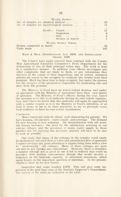 ![Water Supply. No. of samples for chemical analysis No. of samples for bacteriological analysis . . Results : Unsafe Suspicious Safe Broken in transit Water Supply Visits. Houses connected to mains Visits made 22 ] 1 21 6 5 1 32 247 Rats & Mice (Destruction) Act, 1919, and Infestation Order, 1943. The Council have again renewed their contract with the County War Agricultural Executive Committee’s Pests Department for the destruction of rats at their principal refuse tips. The work is done in a satisfactory manner. In addition your officers investigate any other complaints that are made to them, or any infestations they discover in the course of their inspections, and in certain instances poisons are issued to the occupiers to eradicate the vermin from their premises. Much has been done to help occupiers, but under the present law the occupier of the premises is responsible for eradicating rats and mice from his premises. The Ministry of Food have an active rodent division, and under an agreement with the Ministry of Agriculture have their own sphere of operation. The Ministry of Food’s officers, during the year, raised the question as to this local authority having its own rodent organisa¬ tion, and I have no doubt that this authority will again be approached with a similar request as it is the Ministry of Food’s intention, or at least it seems to me to be their intention, to try to persuade every local authority to have its own rodent organisation. Conclusion. Many important tasks lie ahead, each clamouring for priority. We have housing, old and new ; water supply, and sewerage. The demand for new housing is ever widening ; the dissatisfaction with old worn- out houses increases ; the need for the satisfactory sewering of our various villages, and the provision of mains water supply to those parishes not yet enjoying this necessary amenity will have to be met as soon as possible. One reads that many of the cottages in the country could easily , be modernised, but until there is a free and unrestricted flow of materials I cannot envisage any great alteration or repairs being done with a view to “ modernising ” old cottages. Many of these cottages are worn out and do not warrant any expenditure. However, there is doubtless a number (though not so great as one is led to believe) that could be. provided with modern conveniences though this would involve a reduction in the bedroom capacity, or structural extensions, which again hinges on the important question of materials. At the present, emphasis must be for new houses. Inspection and visits totalled 3,973. This will give some im¬ pression of the past busy year of the Sanitary Inspector’s Department. The variety of the visits are indicated on the table.](https://iiif.wellcomecollection.org/image/b30046683_0013.jp2/full/800%2C/0/default.jpg)