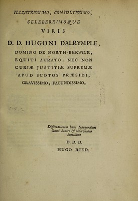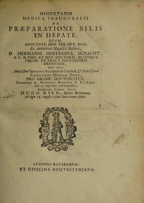 Dissertatio medica inauguralis de praeparatione bilis in hepate. / Quam ... ex auctoritate ... Hermanni Oosterdyk Schacht, ... pro gradu doctoratus, ... eruditorum examini subjicit Hugo Ried, Scoto-Britannus. Ad diem 13. Augusti. 1722.