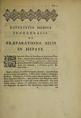 Credit: Dissertatio medica inauguralis de praeparatione bilis in hepate. / Quam ... ex auctoritate ... Hermanni Oosterdyk Schacht, ... pro gradu doctoratus, ... eruditorum examini subjicit Hugo Ried, Scoto-Britannus. Ad diem 13. Augusti. 1722. Source: Wellcome Collection.