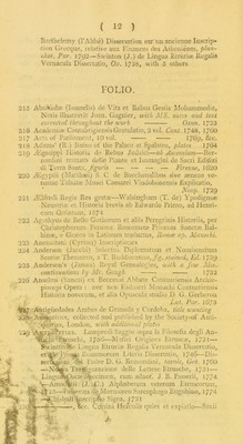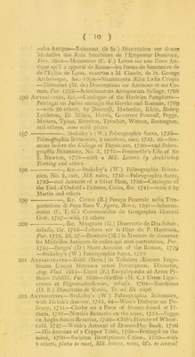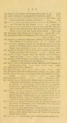 ![—Macklia’s Poets’ Gallery—Rule> for drawing Carica- turas, i/88 130 Arts and Sciences (18) unlound J3I d’Arvieiix’s (Clievalier) Travels in Arabia the Desart, pub- lished by M. de la Roque^ plates — — 1/23 132 Ascham’s (Roger) Sdioleniaster, by James Upton 1/43 133 Asli’s (Dr. John) Experiments and Observations on the Mi- neral Waters of Spa and Aix-la-Chappelle 1/88 134 Astorius (J. Ant.) de Djs Cabiris Fen. 1703 13 j Astrgnomicax—Observations Physiques et Matliematiques, Par. 1737—Costard’s (G.) Letter to M. Folkes on the Rise and Progress of As^^ronomy amongst the Antients^ 1746— Further Account of the same, 1748—Rebatu (F. de) Por- trait de la Diane d’Arles 136 Athenaei Deipnosophistarum Libri quindecim, Graece, G. H. Schafer, p. I. t. I.—p. II. t. I.—p. III. t, 1. Lipsice, 1796 13/ Athenaeus, Gr. Lat. Join Schweighaeuser, 13 vol. hoards, uncut, ' Arg, 1801-5 133 Atwood’s (Tho.) History of the Island of Dominica, 1791— Umfreville’s (Edw.) present State'of Hudson’s Bay, 1790 —Relation of the River Nile, 1791 139 Aubrey’s (Jo,) Miscellanies I696 140 Augustini (Ant.) Fragmeuta Historicorum, a Fi Ursino, Antv. 1595 141 Avieni (Rufl Festi) Descriptio Orbis Terras, ab H Friese- manni Amst. 1786 142 Aulus Gellius . Lugdurii, ].5gi 143 :— Amst. 1666 144 , by the Rev. W. Beloe, 3 vol. — 1/95 145 d’Aussy (le Grand) PTistcire de la Vie privee dcs-Fran9ais, 3 vol. -Par. 1/82 J46 (]\X. le Grand) Voyage d’Auvergne :—— ih, 1788 147 R. (J. G.) Epistola.ad Amicum ■— — — Han. 148 Bacon’s (Lord) Essays — — — — — — 1713 14y Historic of Life and frontispiece 1088 150 * Remains, /icoif 10'79 lol Baily’s (Dr. Tho.) Life and Death of John Fisher Bishop of Rochester, , • 1()55 152 Bajamonti (Dot. Giiil.) Storia della Pcste che regno’ in Dal- mazia negli anni 1783-84, car/a —. — /Vn. 1/86 153 Baker’s (Henry) Poems 1725 154 (Tho.) Rejections upon Learning • 1/27 155 (Henry) Natural History of the Polype, cuts 1/48 150 (Dr. E.) Biographia Dramatic;], 2 vol. — 17B2 4](https://iiif.wellcomecollection.org/image/b2204243x_0031.jp2/full/800%2C/0/default.jpg)