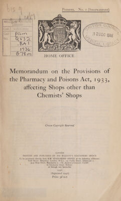 Credit: Memorandum on the provisions of the Pharmacy and Poisons Act, 1933, affecting shops other than chemists' shops. Source: Wellcome Collection.