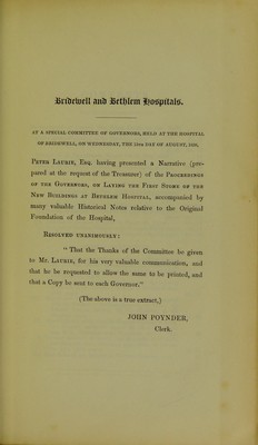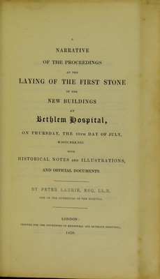 A narrative of the proceedings at the laying of the first stone of the new buildings at Bethlem Hospital on Thursday, the 26th day of July M.DCCC.XXX.VIII : with historical notes and illustrations and official documents / by Peter Laurie.