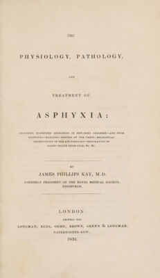 The physiology, pathology, and treatment of asphyxia: including suspended animation in new-born children - and from drowning - hanging - wounds of the chest - mechanical obstructions of the air-passages - respiration of gases - death from cold, &c. &c. / by James Phillips Kay.