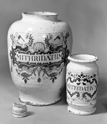 Credit: M0020082: Three drug jars for Mithridatum. Source: Wellcome Collection.