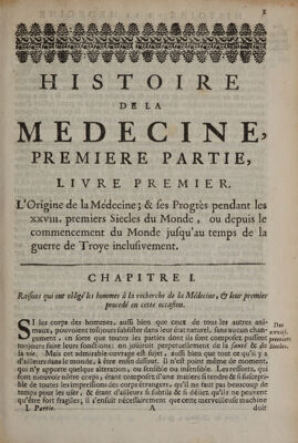 Histoire de la medecine ou l'on void l'origine & les progrès de cet art. De siecle en siecle, les sectes, qui s'y sont formées, les noms des médecins, leursdécouvertes, leurs opinions, & les circonstances le plus remarquables de leur vie. Avec des figures en tailles douces tirées des médailles anciennes / par D[aniel] L[e] C[lerc] D.M.