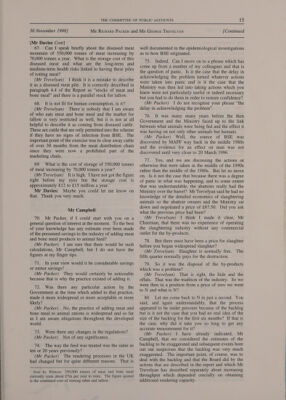 ![i et el [Mr Wardle Cont] of data fields. That took a great deal longer to develop and it was not possible to develop it until well into 1997 because this scheme was not stable; we did not safely operate. Mr Wardle: In the midst of all of this nightmare, Chairman, I am encouraged by Mr Trevelyan’s frankness and by the hint of progress being made. Bearing in mind that I hope to catch your eye when we come to a further session of this Committee before the evening is over, I think I will leave it at that. Mr Steinberg 40. Is it correct to say at the present time there are still approximately 4.25 million cattle over 30 months which will still qualify for the scheme? (Mr Packer) That is broadly correct, Mr Steinberg. 41. So when do you envisage the 30 month scheme will actually end? I ask this question because many, many farmers are putting this question to me. (Mr Packer) We would not envisage the scheme completely ending, although it would be very much phased down, until such time as the last animal born before 1st August 1996 is slaughtered or dies. So we are talking about the final, final ending of the scheme in perhaps 15 years’ time. 42. Good heavens! Can I return to the questioning that the Chairman and Mr Wardle were on? I got the impression when I read the report that in the Department’s case to get the scheme moving very quickly the taxpayer—and I think the Chairman used the word and I have written it down as well—appears to be getting ripped off by both the abattoirs and the renderers. The question was asked but you did not seem to concentrate on a response. I would have thought that where there were over payments these over payments should be repaid in some way, because the amount of money paid out and the amount of profit these people made was absolutely outstanding. Should there not be a system of getting some of this money back? (Mr Trevelyan) As I mentioned earlier, we did reflect in August 1996, when we had the results of the Coopers & Lybrand open books exercise, as to whether given that the mean price, the cost of slaughtering, was about £45 per head we should not attempt to recover that. There were practical difficulties in that this scheme was extremely unstable in its early days with slaughter houses coming in and out of the scheme as they arranged their affairs with their commercial side. As you will recall, the industry was very conscious of the risks of engaging in the 30 month scheme work at the same time as running commercial services, and a number of abattoirs went out having started in. There was also the question of motivation. We were up against the biggest crisis in the operation of the scheme, which was the autumn of 1996, and to enter into a recovery exercise at that point we regarded as having a major disincentive effect. So we took the view, and as Mr Packer has said the scheme has a very long run ahead, that we had to see this additional cost in the early stages as something which was borne by the scheme over its life. 43. Ihave listened to that and I am a total layman in agriculture, but as senior civil servants and top civil servants you seem to be giving the impression that you expression, of what was actually going on. I get the impression that not many questions were asked, for example, about the abattoirs and renderers. You seem to say, “This is nothing to do with us. We are not really au fait with that part of our industry and we know nothing about it.” It seems incredible to me. It is a major part of the industry and yet you seem to be saying you did not know what was going on. I read the report, and I am not very technical, as I say, and keeping it simple it seems to me that both the Board and the Ministry were not on the ball at all. The Board did not seem to understand the capabilities of the abattoirs or the renderers, because somewhere in the report you were requesting tenders and these people could not even tender to the brief you were asking for. That was the Board. The Ministry, for example in one part of the report, said they were not expecting many beef cattle being brought in the scheme which resulted in huge payments and too much compensation. I am astounded that you seem to be so woefully ignorant of what was actually going on and I would be interested in your comments. (Mr Packer) It is no good our pretending to knowledge we do not have, Mr Steinberg. As I was explaining earlier, it really is not the Department’s job to be aware of the detailed economics of all the industries for which we are responsible. Of course, the over 30 month scheme was, I think it is fair to say, an unprecedented scheme. It was introduced at a time of very great lack of confidence in the industry and it was not possible for anyone to predict how many clean cattle, to use the example you gave, would be entered for it. Not merely was it not possible, nobody actually did predict it at the time. It was not just us, nobody else did either. When it became clear that clean cattle were being entered in the scheme, we pressed the Commission to reduce the ratio. We have already touched on that. It took them two or three months to agree to do so. It was unfortunate but it was not our responsibility. We also reduced the rate of payment in line with market prices. It is true that at the early stages the compensation payable under the scheme was high, but that was again a European Commission proposal voted on in the management committee. 44. It just seems strange to me, or unreal to me, that professional civil servants were serially oblivious to what was going on. There was a huge backlog of unsaleable cattle, yet the Ministry did not seem to catch on that this was actually happening, and that eventually it took them six months before it registered and that was around September. I can remember that I received a letter in July 1996 and I wrote to the Secretary of State at the time, not because I knew anything about it but because a farmer had written to m