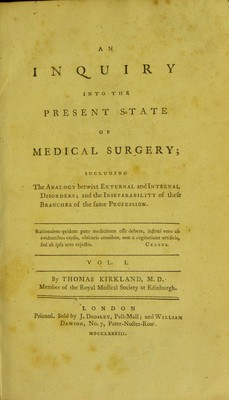 An inquiry into the present state of medical surgery : including the analogy betwixt external and internal disorders; and the inseparability of these branches of the same profession / by Thomas Kirkland, M.D. member of the Royal Medical Society at Edinburgh.