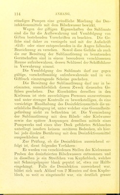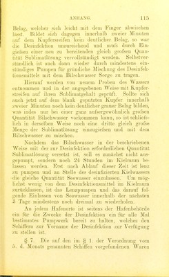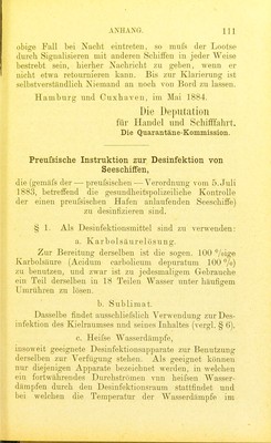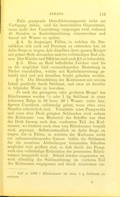 ![sind :äum freien Verkehr zuzulassen, soweit ihre Einfuhr nicht verboten ist. Waren, welche im § 9 der gedachten Verordnung aufgeführt oder, falls sie in der Verordnung nicht ge- nannt sind, gleich den Lumpen, Hadern, altem Bettzeug etc. als giftfangende anzusehen sind, müssen vor dem Eintritt in den freien Verkehr einer gründlichen Des- infektion unter Beachtung der im § 3 dieser Instruktion für Kleider und Effekten gegebenen Vorschriften unter- worfen werden. Zu diesem Behufe sind besondere Desinfektions- räume in den hierzu geeigneten Häfen bereitzustellen. Zur Desinfektion ist die unterbrochene Einwirkung heifser Wasserdämpfe von 100 Grad C. in der im § ] Litt. c. näher angegebenen Weise erforderlich und richtet sich deren Dauer nach der Natur und Beschaffenheit, sowie der Art der Verpackung der Gegenstände. Sind letztere in grofsen Ballen verpackt, welche die Hitze schwieriger in genügenden Grade eindringen lassen, so sind sie Aveuigstens zwei Stunden lang den heifsen Wasserdämpfen auszusetzen. Können in einem Hafen, welchen ein nach § 1 der Verordnung infiziertes Schiff anläuft, die vorschrifts- mäfsigen Desinfektionsmafsregeln nicht getroffen werden, so ist dasselbe abzuweisen und dem zunächst gelegenen, mit den entsprechenden Einrichtungen versehenen Hafen zu überweisen. Berlin, den 13. Juli 1881. Der Minister Der Minister der geistlichen, Unterrichts- für Handel und Gewerbe, u. Medizinalangelegenheiten. In Vertretung von Gossler. von Moeller.](https://iiif.wellcomecollection.org/image/b21781151_0126.jp2/full/800%2C/0/default.jpg)