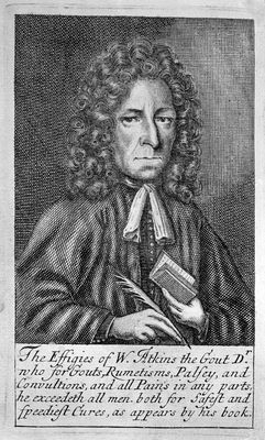 Credit: M0016720EA: Portrait of William Atkins (fl.1694) / M0016720EB: Atkins: <i>The nature of gout</i>, 1694: title page. Source: Wellcome Collection.