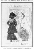 M0018892: Two women observing a sign for buying teeth, print from 1914. In copyright. Source: Wellcome Collection.