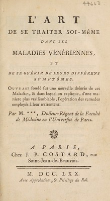 L'art de se traiter soi-même dans les maladies vénériennes, et de se guérir de leurs différens symptômes. Ouvrage fondé sur une nouvelle théorie / ... Par M.*** [i.e. Bourru].