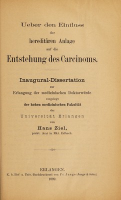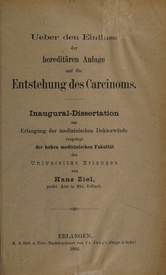 Ueber den Einfluss der hereditären Anlage auf die Entstehung des Carcinoms ... / von Hans Ziel.