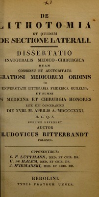 De lithotomia et quidem de sectione laterali : dissertatio inauguralis medico-chirurgica ... / auctor Ludovicus Ritterbandt.