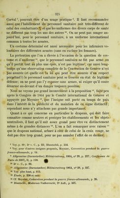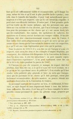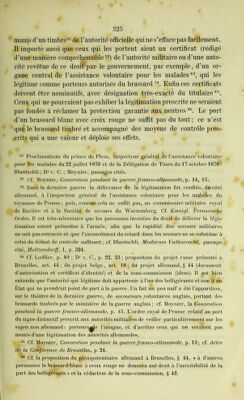 ![Il faut naturellement procéder avec toute la prudence nécessaire au choix des personnes auxquelles on délivre les certificats ; nos observa- tions précédentes sur l’assistance volontaire ont dû le faire compren- dre Enfin une police sévère de guerre rendra possible le contrôle sans lequel on ne pourrait pas supprimer les abus dont le brassard a été l’objet. Si l’on ne réussissait pas à supprimer ces abus et en même temps à empêcher le retour des trop nombreuses violations de l’insigne de la neutralité, il en résulterait, pour la Convention de Genève tout en- tière, ce grave danger que l’on verrait se former contre elle, de la part des militaires surtout, Topposition la plus déclaréeMais, comme nous l’avons fait remarquer, un grand nombre des cas d’abus ou de mépris du brassard doivent être attribués à une publicité insuffisante, relativement aux personnes munies de T insigne de la Convention de Genève. Or il est très-possible de donner à ce signe une publicité gé- nérale. On peut donc espérer que les populations seront toujours plus convaincues de ses heureux effets, et comme la dernière guerre a été poussée à un degré exceptionnel d’excitation et de passion, on peut compter que, grâce à l’influence de l’opinion publique, le respect pour la croix rouge sur fond blanc grandira toujours davantage et que les infractions et les abus deviendront toujours plus rares. Il est bien entendu que celui qui abuse du brassard et le porte sans autorisation est soumis aux lois de la guerre c’est-à-dire doit être puni par son gouvernement. Il est également nécessaire de prendre le plus de précautions possi- ble contre les abus auxquels peut donner lieu le drapeau de la croix rouge. Il pourra toujours y avoir des abus et des actes de déloyauté, et pour beaucoup de choses, il faut s’en remettre à la bonne foi de 27 Voy. plus haut B, 2, h ] cf. Rolin-Jæquemyns , Revue de droit international, III, p. 324, 330. 28 Lœffler, passage cité, p. 79. 22 Cf. Dm-. C., p. 21 ; Bluntschli, p. 337, Moynier, Conve?ition pendant la g lierre franco-allemande, p. 14, et la circulaire de Moltke d^ 10 novembre l870, rendue nécessaire par la fréquence des abus du brassard. 22 Proposé dans le projet de Convention présenté au Congrès de 1864 (voy. plus haut, p. 94), maisrejeté par le Congrès (plus haut, p. 99), ensuite parla Conférence de santé militaire de Berlin (plus haut, p. 122), l’assemblée de Wurzbourg (p. 143) la Conférence de Paris de 1867 (p. 150).](https://iiif.wellcomecollection.org/image/b24867536_0342.jp2/full/800%2C/0/default.jpg)
