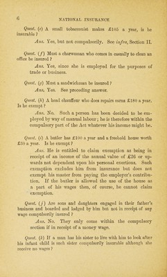 ![Ans. The seaman is not required to pay any contribu- tions while serving on the foreign ship; while so employed he would be regarded for the purposes of the Act as un- employed. To avoid falling into arrears he could pay the whole contribution himself, as other unemployed persons are entitled to do. Quest. {1) What is the position of a chauffeur who goes abroad with his master touring ? Ans. It depends upon whether such employment can be referred to as “employment in the United Kingdom.” It is clear that while in the United Kingdom he is com- pulsorily insured, it may be that the whole service is employment in the United Kingdom with an incident attached that the person may be required to go abroad ever so often. If this is so the person is compulsorily insurable, and the master could stamp his card in advance before going abroad. Quest, (c) A person is permanently employed for a society for a few hours a week at £15 a year. His main source of income is derived from doing odd jobs as a carpenter. What is his position ? Ans. As a jobbing carpenter he is not under a contract of service with anybody—he is on his own—therefore not compulsorily insurable. As to the permanent em- ployment he is within the compulsory part of the Act unless such employment comes within the employments excepted as being subsidiary employment specially ex- cepted by Orders I. and l.a of the N.H.I.C. See infra, Section V. Quest. (d) A woman takes in lodgers and waits on them herself: is she compulsorily insured ? Ans. Such a person is not under a contract of service. Consequent]v she need not be insured.](https://iiif.wellcomecollection.org/image/b28112787_0031.jp2/full/800%2C/0/default.jpg)