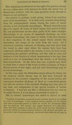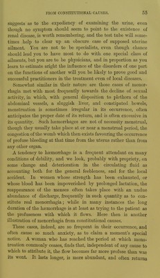 ![Any sudden shock, either acting locally on the uterine organs, as the application of cold to the vulva, or through the medium of the general system, as when a person gets wet-footed, or suffers during menstruation from exposure to wet or cold, will often check the menstrual flux. In many of these cases, too, the sudden arrest of the discharge is followed by extreme uterine pain and tenderness, by all the symptoms of intense uterine congestion, sometimes, indeed, by actual uterine inflammation. The mind, too, reacts upon the body, as we see perpetually illustrated in the case even of those functions that might be supposed most independent of its influence, and many instances might be related of sudden grief, or fear, or anger, at once arresting the menstrual discharge. But other causes acting through the mind tend, though less suddenly, to diminish the activity of the sexual functions, to lessen and at last to put a stop to menstruation; and a French physician, M. Pidoux,* notices this as a not infrequent occurrence among members of Eoman Catholic sisterhoods. That, however, which it imports us more to bear in mind is, that in young girls in whom menstruation has been but recently established, a return to school or a resumption of lessons at home is not very seldom followed by an interruption of the function. The accident is in many cases due entirely to the intellectual effort, not to the want of physical care; and this is shown by the fact that the mere removal from school, unless accompanied with the discontinuance of study, will not suffice to remove the amenorrhcea. But various though its causes may be, yet the treatment of suppression of the menses rests for the most part on very simple principles, and those the same in almost all instances. Two points require attention; first, to re-excite menstruation at once, if possible; second, to provide for its] re-establishment when the proper period once more comes round. If the hot hip or foot bath, or a warm bath, bed, and a cordial or diaphoretic, fail to reproduce the menses when suddenly checked by cold, or by any other cause, we must wait patiently till the next menstrual period comes round, unless indeed urgent symptoms supervene, betoken- ing great congestion, or inflammation of the uterus, and they may * Quoted by M. Martineau, in his Trait4 Clinique des Affections do V Uterus, 8vo, 1878, p. 41.](https://iiif.wellcomecollection.org/image/b21923796_0067.jp2/full/800%2C/0/default.jpg)