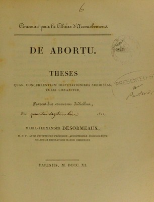 De abortu : theses quas, concurrentium disputationibus submissas, tueri conabitur, praesentibus concursus judicibus, die [quarta septembris] 1811 / Maria-Alexander Desormeaux.