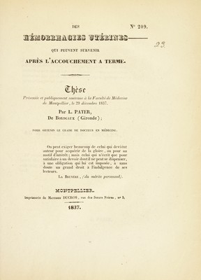 Des hémorrhagies utérines qui peuvent survenir après l'accouchement à terme : thèse présentée et publiquement soutenue à la Faculté de médecine de Montpellier, le 29 décembre 1837 / par L. Pater.