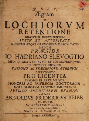 Credit: Aegram ex lochiorum retentione graviter decumbentem / ... publico eruditorum examini exhibebit Arnoldus Fridericus Beier. Source: Wellcome Collection.
