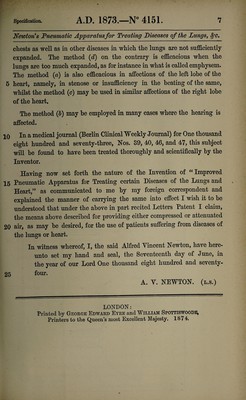 Credit: Specification of Alfred Vincent Newton : pneumatic apparatus for treating diseases of the lungs and heart. Source: Wellcome Collection.