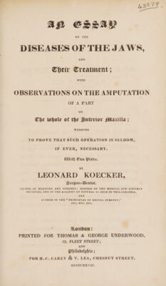 An essay on the diseases of the jaws, and their treatment; with observations on the amputation of a part or the whole of the inferior maxilla; tending to prove that such operation is seldom, if ever, necessary / By Leonard Koecker.
