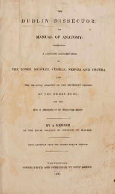 The Dublin dissector or manual of anatomy. Comprising a concise description of the bones, muscles, vessels, nerves and viscera, also the relative anatomy of the different regions of the human body, for the use of students in the dissecting room / By a member of the Royal College of Surgeons in Ireland [i.e. R. Harrison].