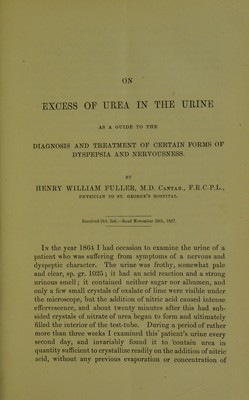 On excess of urea in the urine as a guide to the diagnosis and treatment of certain forms of dyspepsia and nervousness / by Henry William Fuller, M.D.