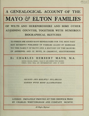 A genealogical account of the Mayo & Elton families of Wilts and Herefordshire and some other adjoining counties, together with numerous biographical sketches : to which are added many genealogies for the most part not hitherto published of families allied by marriage to the family of Mayo and a history of the manors of Andrewes and Le Mote, in Cheshunt, Hertfordshire / by Charles Herbert Mayo.
