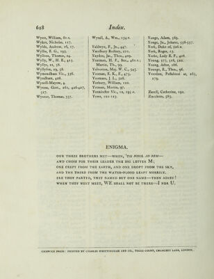 ![Wyett, William, 8i n, Wykes, Nicholas, 117. Wylde, Andrew, 16, 17. Wyllie, E. G., 193. Wyllton, Thomas, 24. Wylly, W., H. E., 423. Wyllys, 22, 58. Wyllyfon, 29, 58. VVymondham Vic., 336. Wyndham, 408. Wynell-Mayow, 4. Wynne, Gert., 261, 426-427, 527- Wynter, Thomas, 357. Wyrall, A., Wm., i34». Yaldwyn, F., Jn., 447. Yatefbury Reftory, 211. Yayden, Jas., Thos., 409. Yeatman, H. F., Sus., 461;/.; Martin, Th., 99. Yelverton, Maj. W. C., 54;. Yeoman, E. K., F., 475. Yeomans, J. L., 328. Yerbury, William, 120. Yetman, Martin, 97. Yetminller Vic., 12, 195 n, i Yewe, 122-123. Yonge, Adam, 569. Yonge, Jn., Johane, 556-557. York, Duke of, 326 n. York, Roger, 13. ] Yorke, Lady E. P., 408. Young, 377, 518, 520. Young, Aftor, 186. Younge, E., Thos., 96. Yverdun, Peftalozzi at, 26 279. Zazell, Catherine, 192. Zucchero, 583. ENIGMA. OUR THREE BROTHERS MET WHEN, ’tIS NIHIL AD REM AND CHOSE FOR THEIR LEADER THE BIG LETTER M; ONE CREPT FROM THE EARTH, AND ONE DROPT FROM THE SKY, AND THE THIRD FROM THE WATER-FLOOD LEAPT MERRILY. ERE THEY PARTED, THEY NAMED BUT ONE NAME THEN ADIEU ! WHEN THEY NEXT MEET, WE SHALL NOT BE THERE 1 NOR U. CHISWICK PRESS : PRINTED BV CHARLES WHITTINGHAM AND CO., TOOKS COURT, CHANCERY LANE, LO.VDON,](https://iiif.wellcomecollection.org/image/b24883815_0754.jp2/full/800%2C/0/default.jpg)