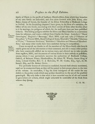 A genealogical account of the Mayo & Elton families of Wilts and Herefordshire and some other adjoining counties, together with numerous biographical sketches : to which are added many genealogies for the most part not hitherto published of families allied by marriage to the family of Mayo and a history of the manors of Andrewes and Le Mote, in Cheshunt, Hertfordshire / by Charles Herbert Mayo.