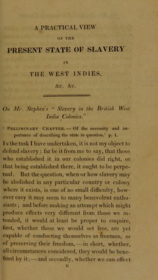 A practical view of the present state of slavery in the West Indies, or, An examination of Mr. Stephen's "Slavery of the British West India Colonies:" containing more particularly an account of the actual condition of the negroes in Jamaica: with observations on the decrease of the slaves since the abolition of the slave trade, and on the probable effects of legislative emancipation: also, strictures on the Edinburgh Review, and on the pamphlets of Mr. Cooper and Mr. Bickell / By Alexander Barclay, lately and for twenty-one years resident in Jamaica.