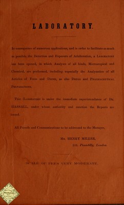 Credit: Food and its adulterations ; comprising the reports of the Analytical Sanitary Commission of "The Lancet" for the years 1851 to 1854 inclusive, revised and extended: being records of the results of some thousands of original microscopical and chemical analyses of the solids and fluids consumed by all classes of the public ; and containing the names and addresses of the various merchants, manufacturers, and tradesmen of whom the analysed articles were purchased / by Arthur Hill Hassall. Source: Wellcome Collection.