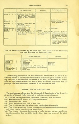 Credit: Food and its adulterations ; comprising the reports of the Analytical Sanitary Commission of "The Lancet" for the years 1851 to 1854 inclusive, revised and extended: being records of the results of some thousands of original microscopical and chemical analyses of the solids and fluids consumed by all classes of the public ; and containing the names and addresses of the various merchants, manufacturers, and tradesmen of whom the analysed articles were purchased / by Arthur Hill Hassall. Source: Wellcome Collection.